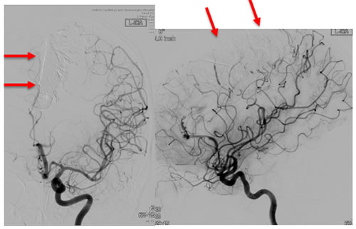 脳内出血や脳室内出血をおこすことが多く、突然の頭痛、嘔吐、意識障害、片麻痺、また、けいれん発作がおこり、精密検査で発見されることもあります。20~40歳代と若い世代におこることが多いものです。診断はCTやMRIで脳の中を撮影すると、出血や異常血管が映ります。より詳しい状況を知るためには、脳の動脈に造影剤を注入してX線撮影する脳血管撮影が必要です。
