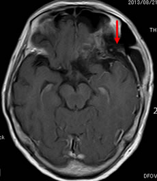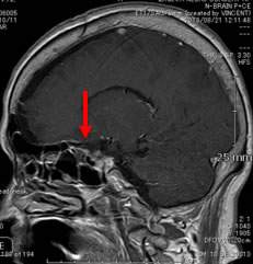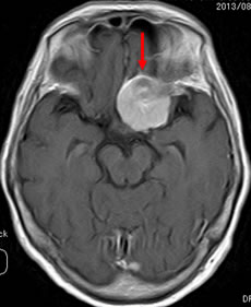 髄膜腫は全脳腫瘍のうち約25%前後を占めるといわれ、くも膜という脳を覆っている膜の細胞から発生する良性の腫瘍です。発生しやすい場所は大脳半球円蓋部、傍矢状洞部、大脳鎌など様々で、徐々に増大し脳を圧迫していきます。発生する部位により精神症状・麻痺症状・けいれん・知覚障害・視力視野障害などいろいろな症状をきたします。徐々に大きくなると脳の圧迫が強くなり、放置しておくと生命に危険を及ぼす可能性があります。髄膜腫はゆっくりと大きくなる腫瘍ですので一刻を争う必要はありません。非常に小さいうちにみつかれば、数ヶ月後に検査を行い、増大していれば手術という選択肢もあります。みつかった時点で大きかったり、脳浮腫を伴ったりしているものでは外科的摘出を行います。腫瘍が大きくなればなるほど、手術が困難になる可能性は高いと考えられます。特に当院では外科的摘出術に先立ち、脳血管内治療による塞栓術を行っています。通常大きな腫瘍、又は増大している腫瘍は栄養血管が発達している事がほとんどです。栄養血管を塞栓する事により、手術中の出血を減らし、腫瘍が柔らかくなり摘出し易くなる事も期待出来ます。
