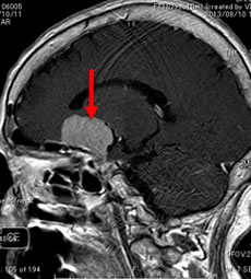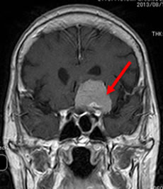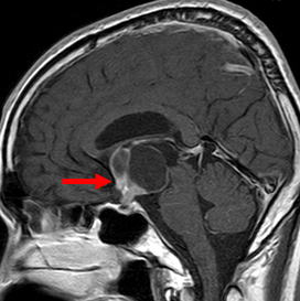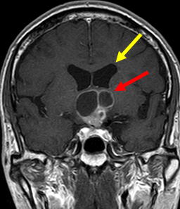 良性脳腫瘍の代表的なもののひとつで、視床下部や下垂体といった重要構造物の近くに発生する腫瘍です。胎生期の頭蓋咽頭管が消えずに残ったものから発生する先天性腫瘍と考えられています。原発性脳腫瘍の3%を占め、全年齢層にわたってみられますが、約20%は15歳未満の小児期に発生し、小児脳腫瘍の中の約9%(第4位)を占めます。ホルモンの中枢である下垂体柄に発生し、頭蓋底の中央にあるトルコ鞍と言うくぼみの直上に7割が存在します。嚢胞を形成しやすく、中にモーター油様の内用液とコレステロール結晶を含みます。腫瘍実質内には、石灰沈着がみられます。腫瘍そのものは良性の性質を持つのですが、発生部位が脳の奥深くであり、かつ機能的に重要な役割を担う構造物近傍に発生するため、慎重な治療介入が求められる疾患です。頭蓋咽頭腫が発生する脳の奥深くには、下垂体と呼ばれる構造物が存在することが知られています。下垂体は、身体の恒常性や活動に際して必要不可欠な多くのホルモンを分泌しています。これらの機能が障害されることから、下垂体機能低下症に伴う症状や尿崩症(尿が多量に出る)などを呈することになります。頭蓋咽頭腫の発生部位の上方には視床下部が存在しています。視床下部にはさまざまな中枢機能が備わっており、体温調節、モルモン分泌の調整、情動や性欲、記憶の管理などを行っています。頭蓋咽頭腫ではたとえば肥満や性格の変化といった合併症を呈することがあります。更に近くに視神経が存在しており、視力視野障害や異常が生じることになります。加えて、髄液の流れが障害を受けることから頭痛、水頭症を発症することになります。成人では、視神経症状と精神症状で発症することが多いです。治療は良性腫瘍で、開頭全摘出により完全治癒が期待できますが、周辺の重要神経組織との癒着、浸潤がある場合は、全摘出は困難です。非全摘例には、再発防止のためにガンマナイフによる残存腫瘍に対する補助的な治療は8割以上に有効とされています。最近、内視鏡を併用した低侵襲手術手技の発達に伴い、開頭をせずに経副鼻腔(蝶形骨洞)的に摘出術が限られた症例のみ可能となりつつあります。