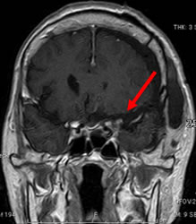 図2-c 矢印の様に下垂体柄周囲に腫瘍像が一部残っていますがその他の腫瘤は摘出されています。 |