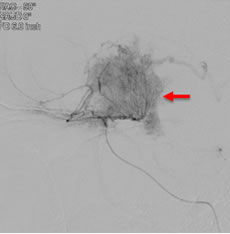 図4-a:術前血管撮影, 栄養血管からの造影では赤矢印の様に腫瘍濃染を認める。 |
