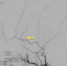 図4-b:塞栓後血管撮影, 黄色矢印の様に腫瘍濃染は消失した。 |