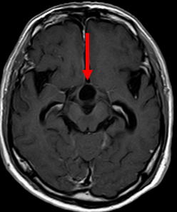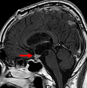 図2-b 矢印の様に下垂体柄周囲に腫瘍像が一部残っていますがその他の腫瘤は摘出されています.脳室は大きいですが、術後見当識障害は改善し、正常に戻り、水頭症の症状を認めていないので経過観察としております。 |